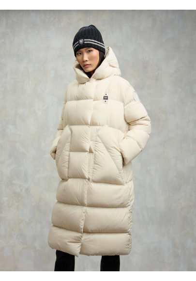 Plumífero largo acolchado a rayas horizontales e interior en contraste de color. Prenda con relleno natural suave, cálido y poco voluminoso, de colores fashion y corte que realza la cintura.